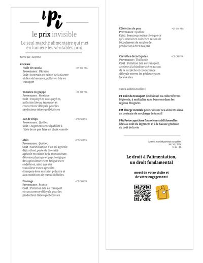Le prix invisible des aliments représente les coûts liés à la production de ceux-ci qui peuvent être physiques (par exemple, les impacts environnementaux), sociaux (par exemple, les conflits armés) ou mentaux (par exemple, le stress lié à l'accès aux aliments).
